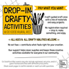 A self-guided craft space with a mix of materials and simple projects to explore at your own pace. No registration required — drop in, make something, and enjoy.